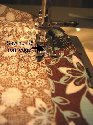 Sew 1/8” from the pressed edge leaving a 1” opening by one of the side seams.